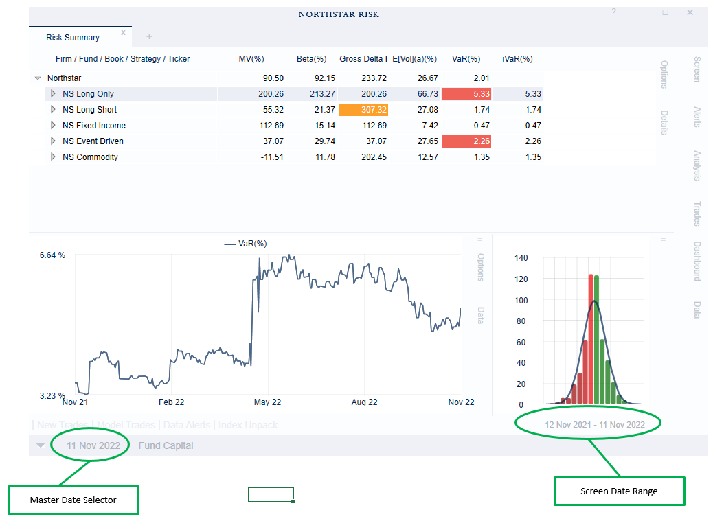 Screen Date Range: located at the bottom-right, used for screens containing fields that require a date range. Many statistics reflect the state of the current portfolio and do not require a date range (for example, VaR), but other fields require a date range (for example, P&L). This selector will change the date range for all fields on the current screen.